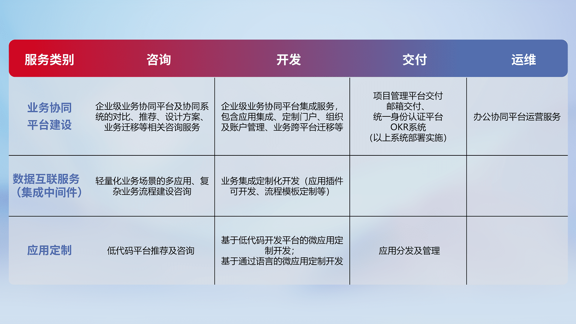 针对钉钉、、、企微、、IDaas等平台级产品提供产品的规划、、、方案、、交付、、、定制化开发等服务,,,,实现如统一协同办公、、智能客户服务、、、、混合会议管理、、、、智能数据查询、、、等业务场景,,,实现数字化转型。。。